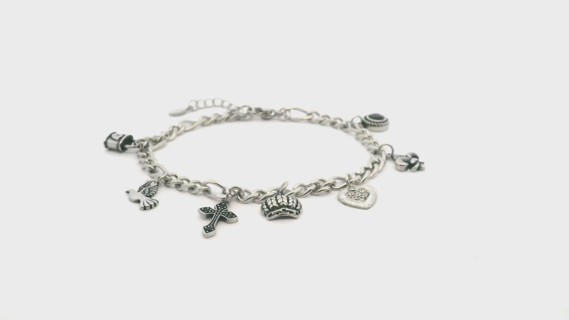 Unleash your daring spirit with this symbolic bracelet! Designed with a sturdy Figaro chain, it features charms that represent strength, peace, faith, royalty, love, and elegance. Built to last and perfect for stacking or wearing solo, capture the essence of adventure with this versatile piece.