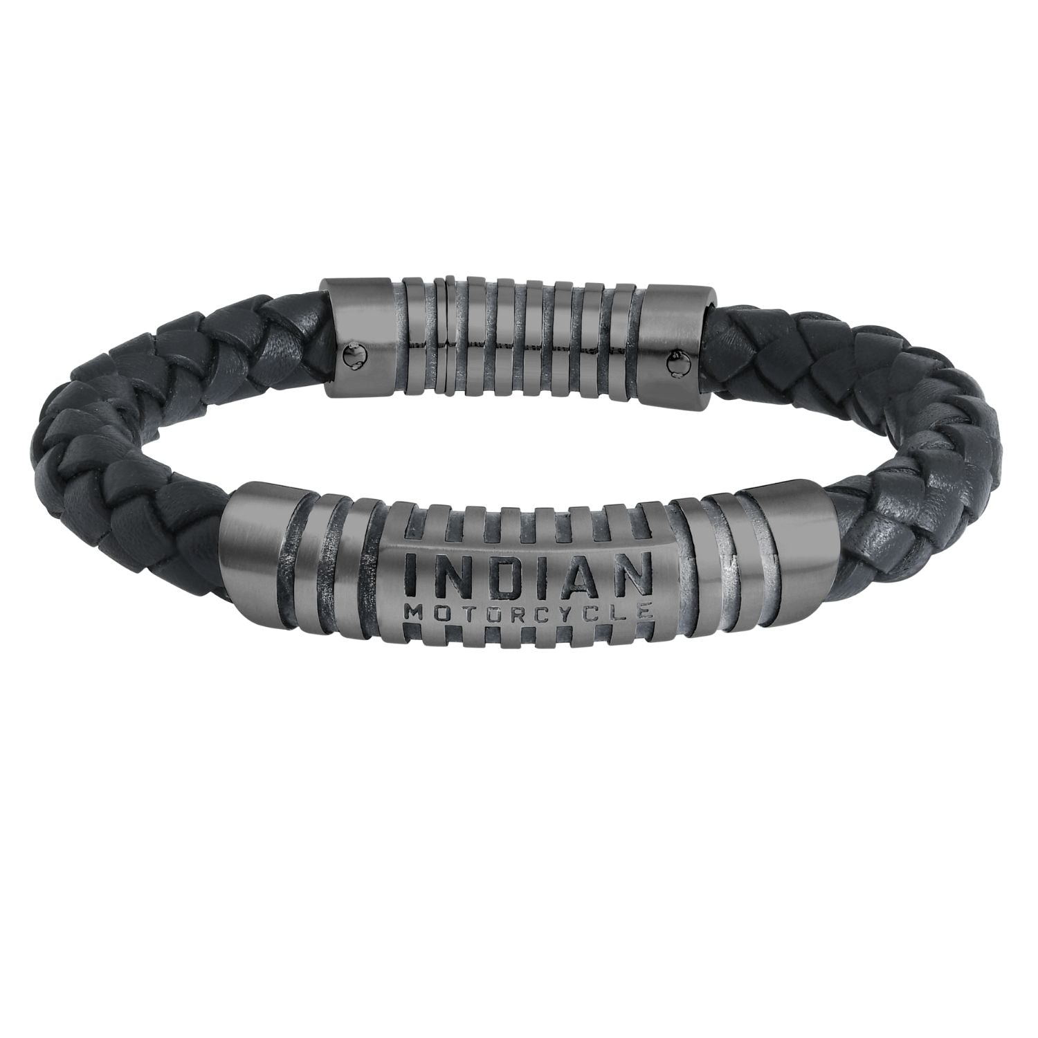 Rugged and bold, the Engine Lines Bracelet in Gunmetal features a sleek stainless steel design with a durable PVD finish. The braided leather band adds a touch of texture, while the engraved centerpiece reflects the spirit of Indian Motorcycle. Secured with a push-button clasp for easy wear, this bracelet is the perfect blend of strength and style.