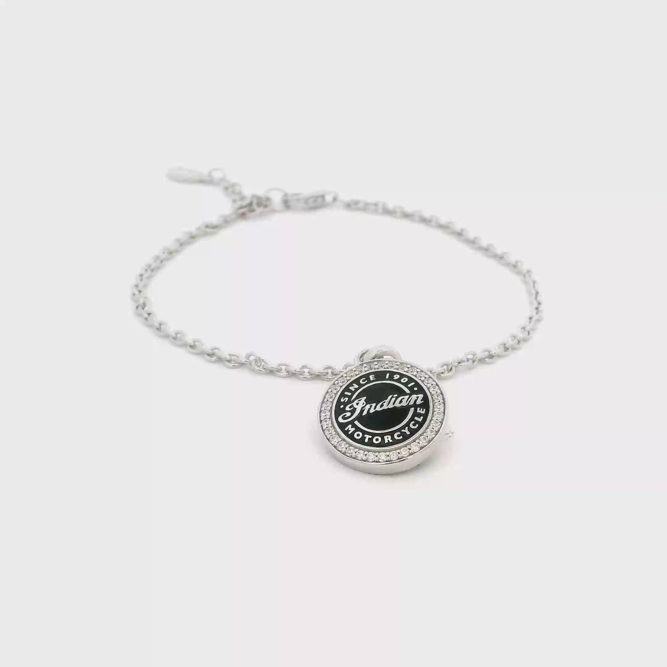Add a touch of sophistication to your collection with the Roundel Script & Bling Bracelet, expertly crafted from premium sterling silver. The bracelet showcases a Roundel pendant adorned with the iconic "Indian Motorcycle" script logo and encircled by glittering white stones. The adjustable chain, complete with a secure lobster clasp, offers comfort and style, making it an ideal accessory for any occasion.