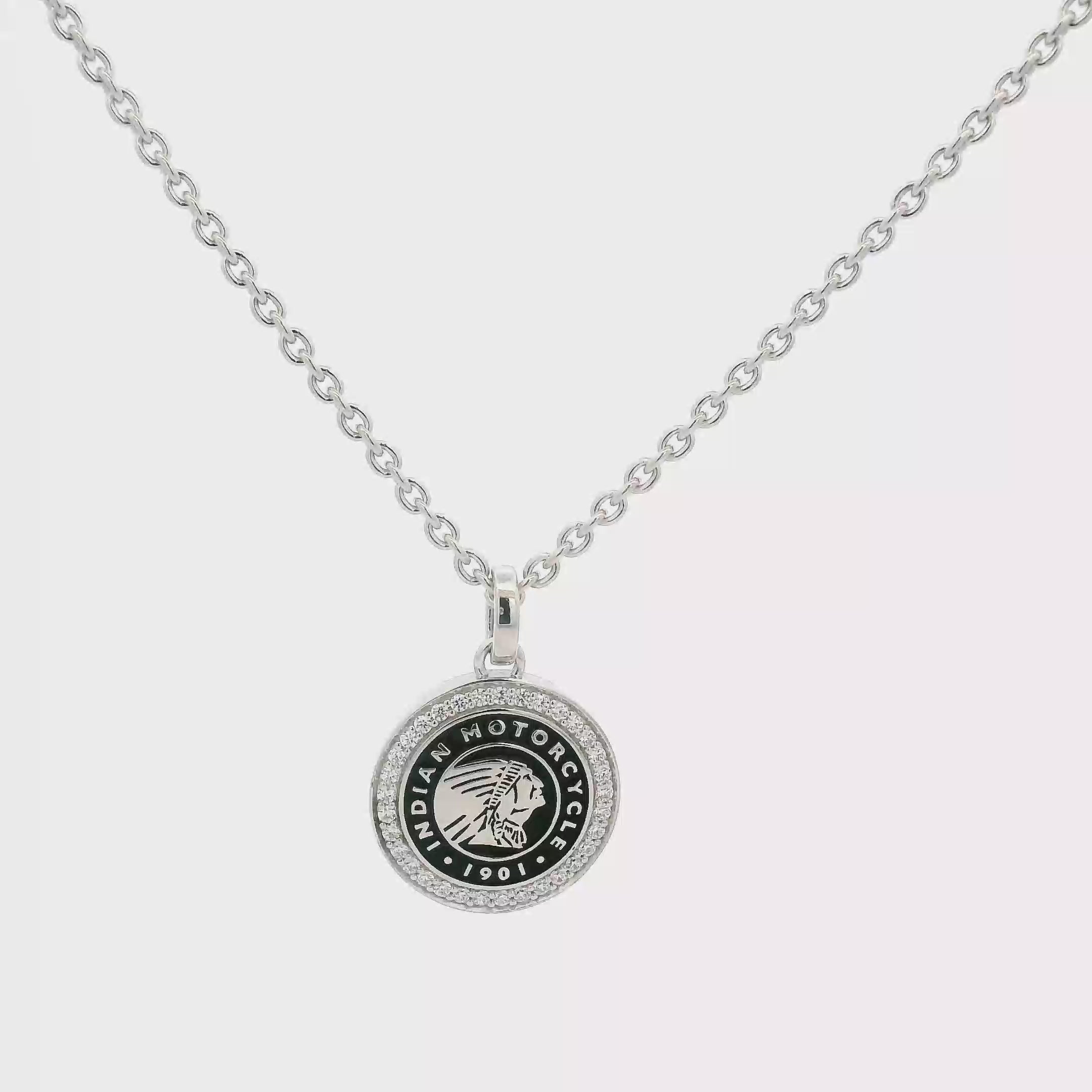 Classic yet striking, the Roundel Headdress Silver & Bling Necklace is the perfect blend of heritage and elegance. Crafted from sterling silver, this pendant features the iconic Indian Motorcycle headdress logo, surrounded by sparkling pavé crystals that add a touch of brilliance. Designed with an adjustable chain, it’s ideal for layering or wearing as a statement piece. Whether on or off the bike, this necklace is the perfect way to showcase your love for Indian Motorcycle.