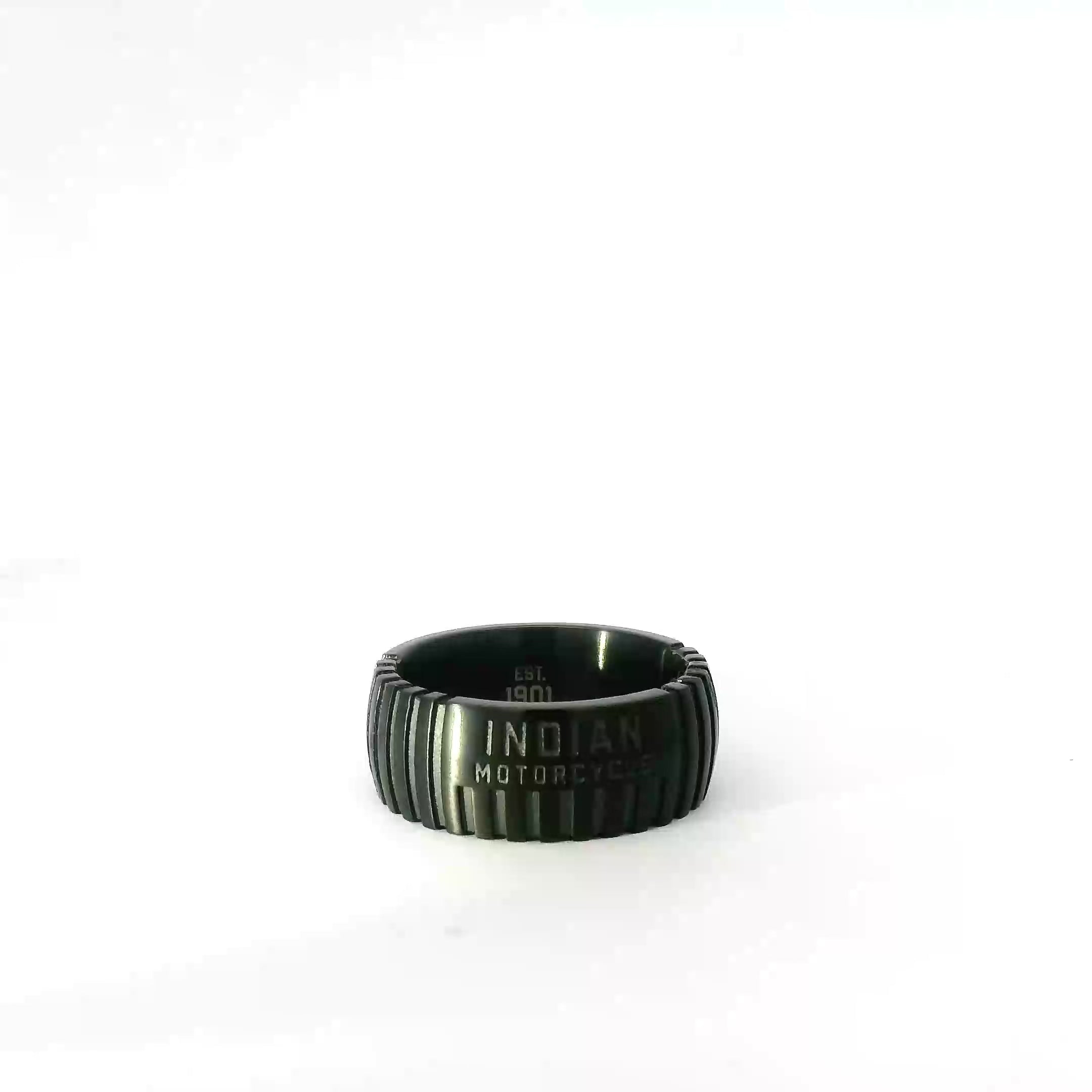 Add a touch of rugged sophistication to your look with the Engine Lines Band Ring in Gunmetal. Crafted from premium stainless steel, this 10mm wide ring features vertical lines reminiscent of engine fins, giving it an industrial and masculine appeal. The dark gray PVD finish ensures durability and a sleek look, making it perfect for everyday wear or special occasions. Elevate your accessory game with this distinctive ring that celebrates the legacy of Indian Motorcycle. Available in whole sizes 9 - 15.